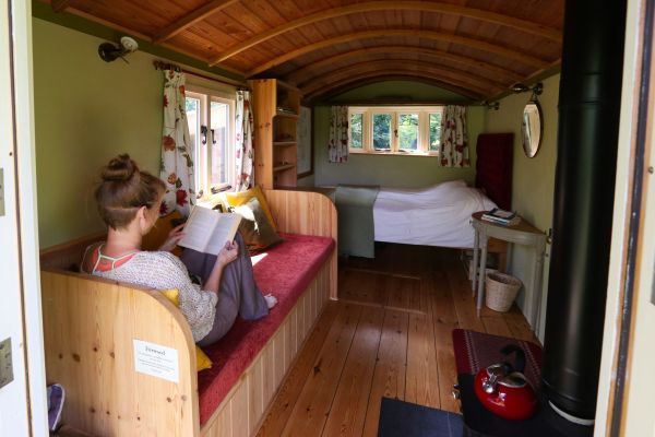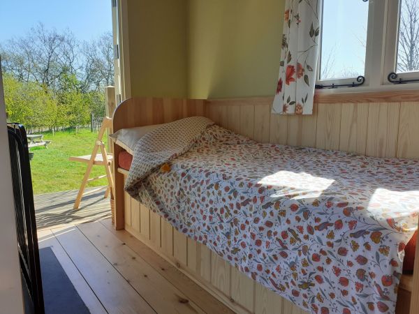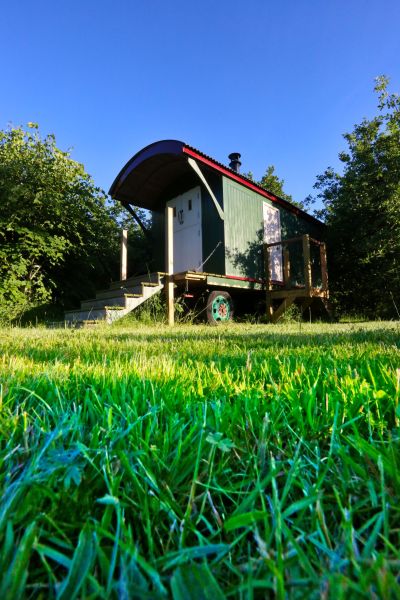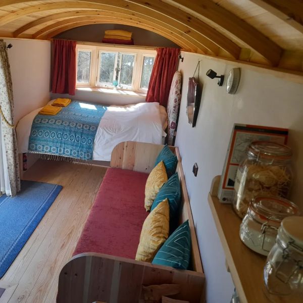 Built by us out of reclaimed materials, the first Shepherd Hut served as part of the temporary accommodation our family lived in while completing an eco self build in 2012. In 2023 we added a second home-built wagon.